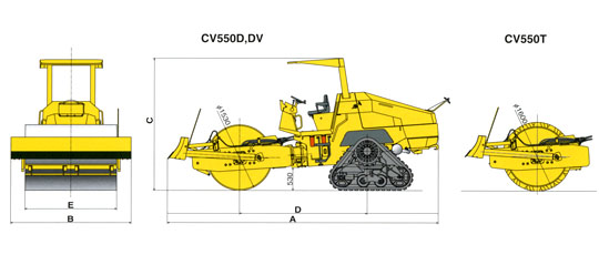 | Wide variation of drum types; Smooth drum or padfoot drum with standard vibration mode (single eccentric type) or vertical vibration mode (twin eccentriic type) are available to select from Standard vibration models: CV550D (smooth drum), CV550T (padfoot drum) and Vertical vibration model; CV550DV (smooth drum). |